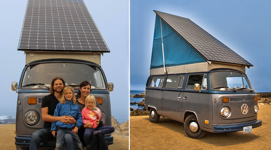 Depuis 2016, la famille Belan longe la Côte californienne à bord de leur vieux combi Volkswagen de 1973. Sa particularité est qu’il n’est pas alimenté par de l’essence, mais bien via l’électricité produite par les panneaux solaires installés sur le toit du van.