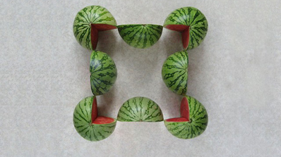 L’artiste turc Sakir Gökçebag s’est servi de son talent créatif pour mettre en forme des œuvres géométriques utilisant la couleur, l’aspect, les caractéristiques de certains fruits et légumes. C’est tout un univers qui a été inventé pour réaliser des travaux surprenant à l’aide de pommes, pastèques, haricots verts et autres.