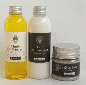 ● Un pot de sels de bain 50 ml : S’applique sur peau humide en massages circulaires pour une action exfoliante. Les sels fondent au contact de l’eau, et laisse la peau douce et veloutée. ● Un lait raffermissant 75 ml : Frais, nourrissant et délicatement parfumé, ce lait s’applique après la douche ou le bain pour raffermir votre peau. ● Une huile de massage 75 ml : A base d’huile d’amande douce, aux propriétés émollientes, cette huile adoucissante est idéale pour le massage.